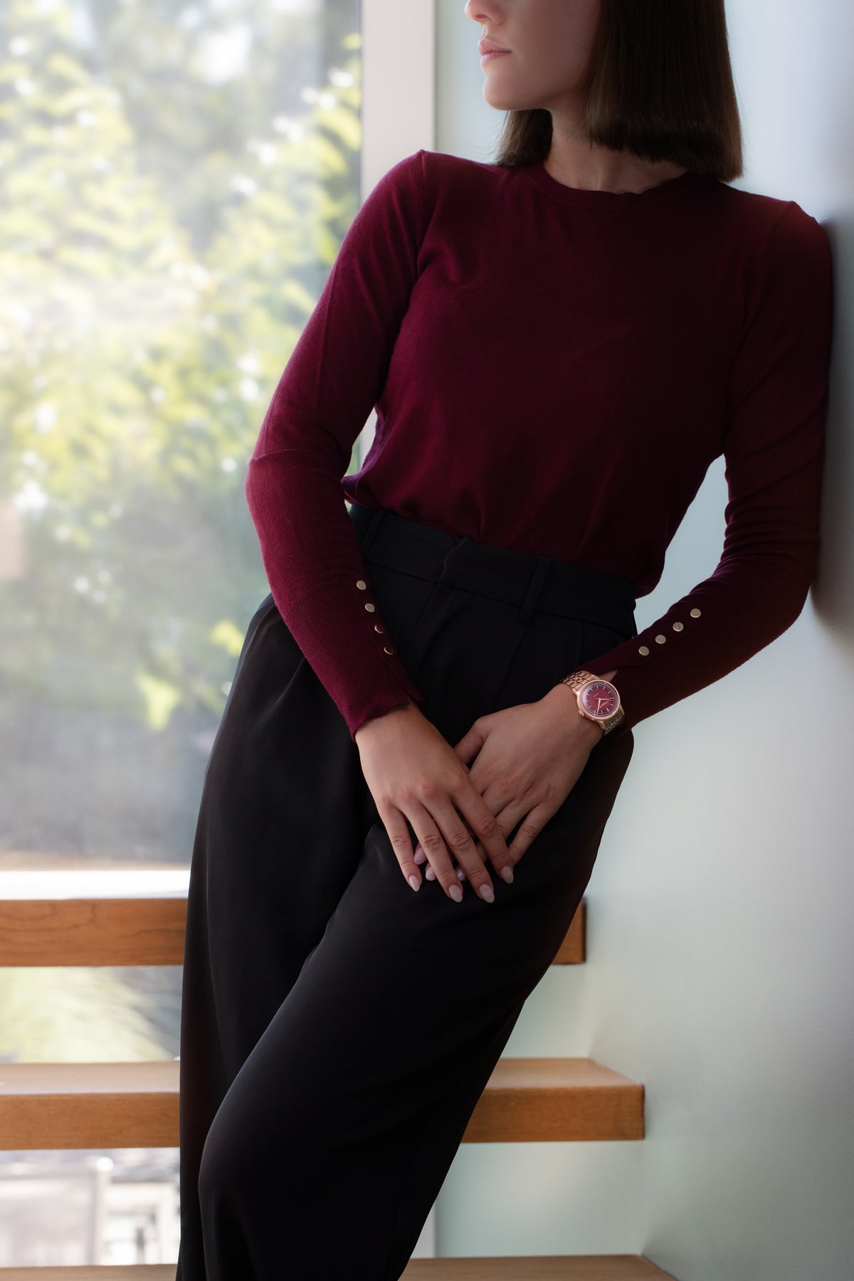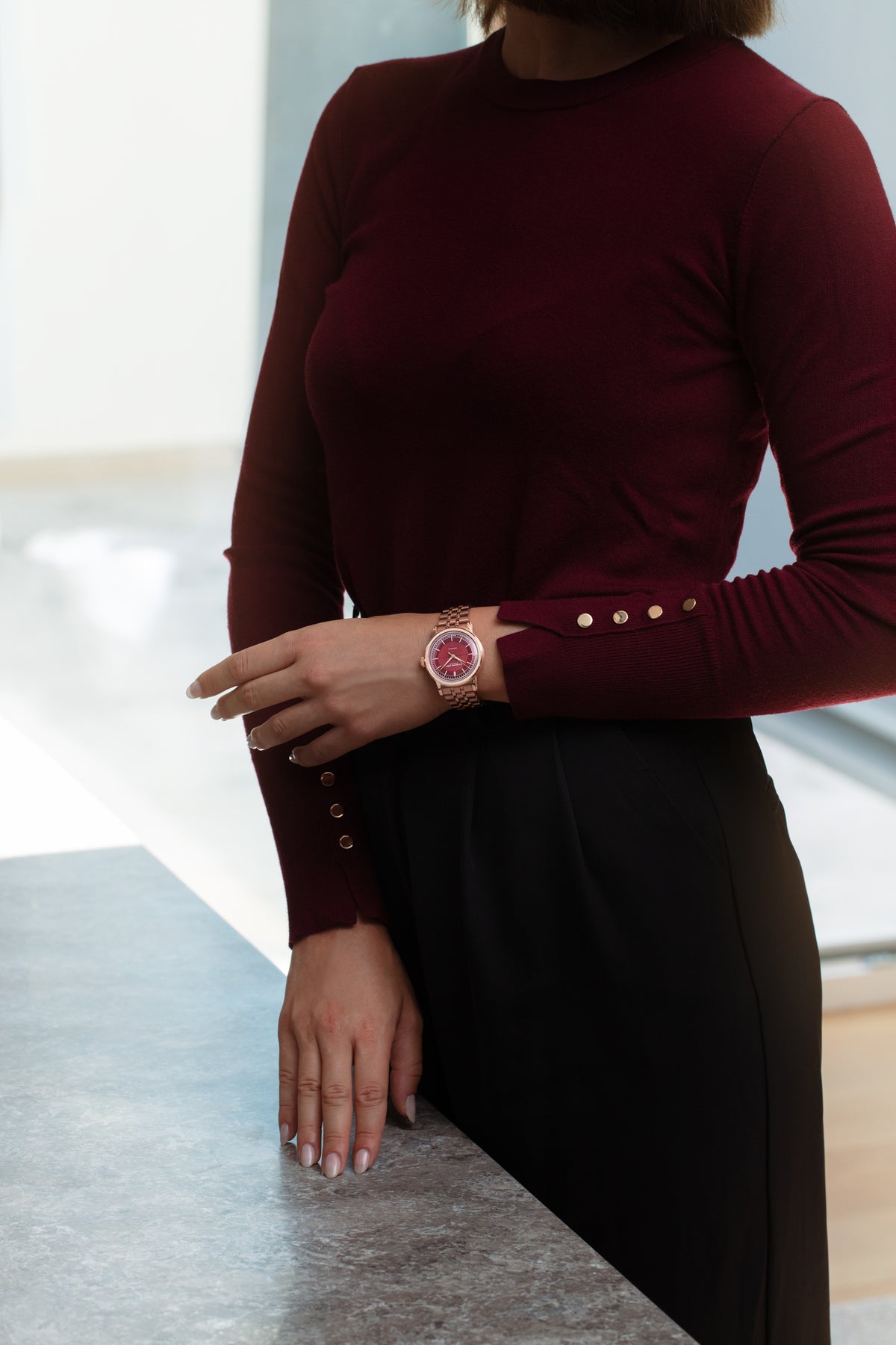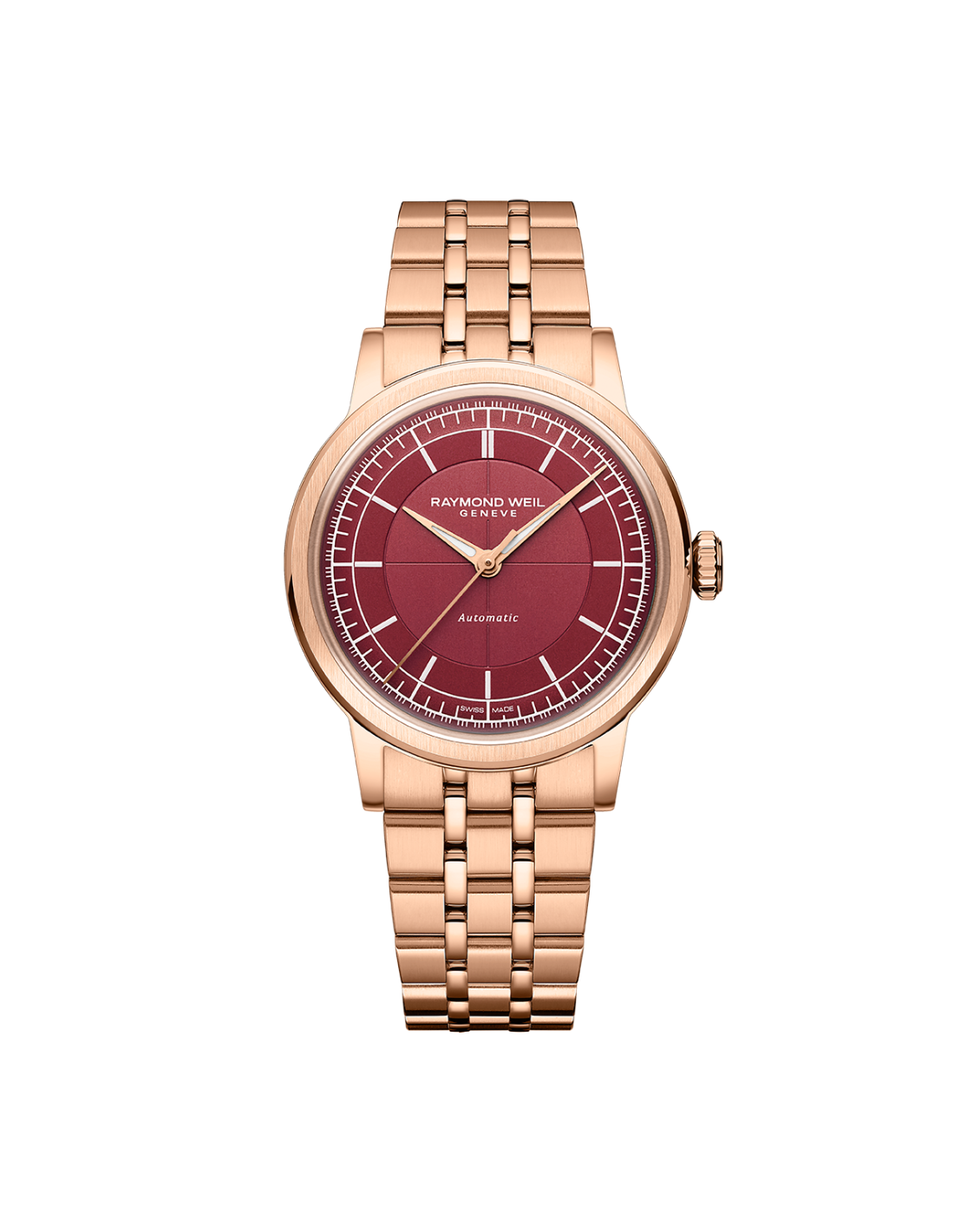 Raymond Weil Millesime med burgunderrød sektorskive kombinerer klassisk urmakertradisjon med et moderne, lettlest og elegant uttrykk. Den dype rødfargen gir klokken et unikt og eksklusivt preg, mens de sølvfargede viserne med Super-Luminova® sørger for god lesbarhet både dag og kveld. Den detaljerte sektorskiven er bygget opp av flere overflater – en glatt timering, en minuttskala med sirkulært strukturmønster og en vertikalt børstet midtdel – noe som skaper dybde og et raffinert visuelt uttrykk.