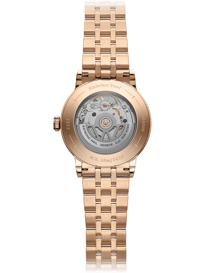 Det svakt buede safirglasset gir klokken et subtilt vintageuttrykk, samtidig som dobble antirefleksbelegg sikrer klar lesbarhet fra alle vinkler. Urkassen på 35 mm er laget i rustfritt stål med roségull PVD-finish, en kombinasjon som gir en varm og elegant kontrast. Gjennom baklokket i safirglass kan du se det selvtrekkende RW4200-urverket, komplett med Raymond Weils karakteristiske W-formede rotor. Med en gangreserve på 41 timer er klokken pålitelig og praktisk i hverdagen.